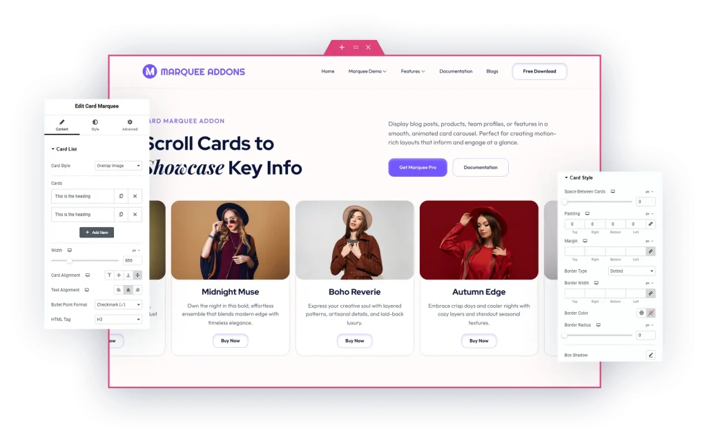 Make your content scroll smartly with interactive, animated cards. Showcase blog posts, product items, services, or team profiles using smooth marquee motion that grabs attention and improves engagement — all inside a single, powerful widget.