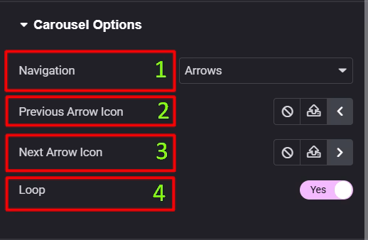 - Loop: Enable continuous looping so the carousel starts again after the last item (or disable to stop at the ends).