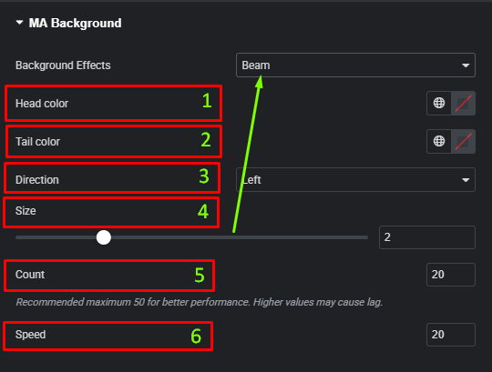 - Count: Control how many beams appear at once (Recommended maximum: 50).