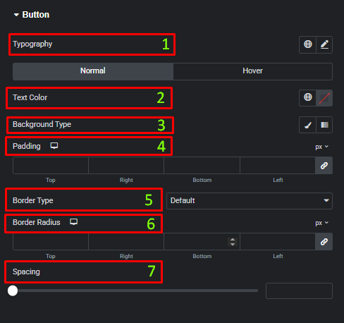 - Background Type: Choose Classic or Gradient for the button background, with separate options for Normal and Hover states.