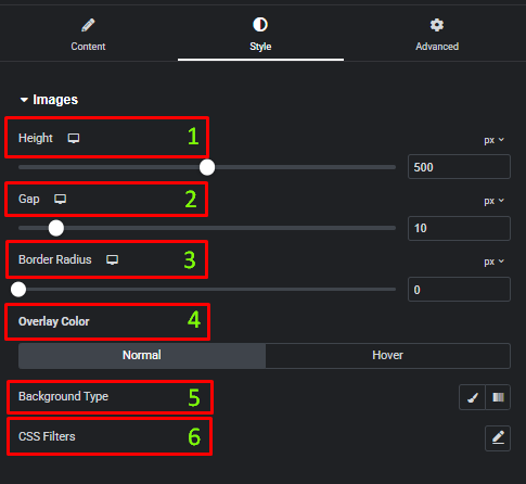 - Overlay Color: Set the color of the image overlay for both normal and hover states.