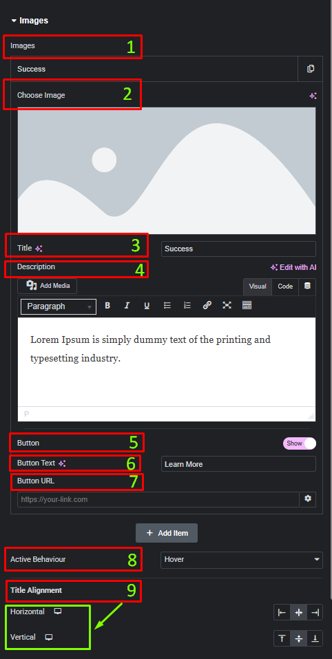 - Images: Use this repeater field to add and manage the individual accordion items. Click “Add Item” to include more.