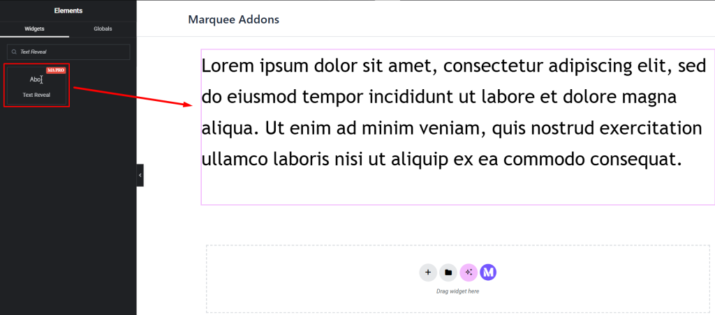 - Search for the Text Reveal widget in the left-hand panel.