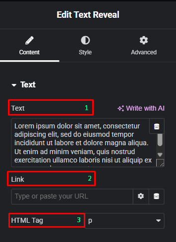 - Text: Enter the text you want to animate. You can also use the Write with AI feature to generate copy or use Dynamic Tags to pull content from your site.