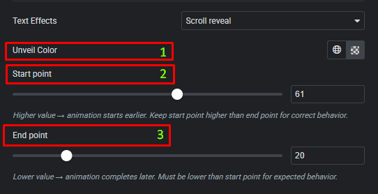 - Start Point: Define when the reveal animation begins based on scroll position.