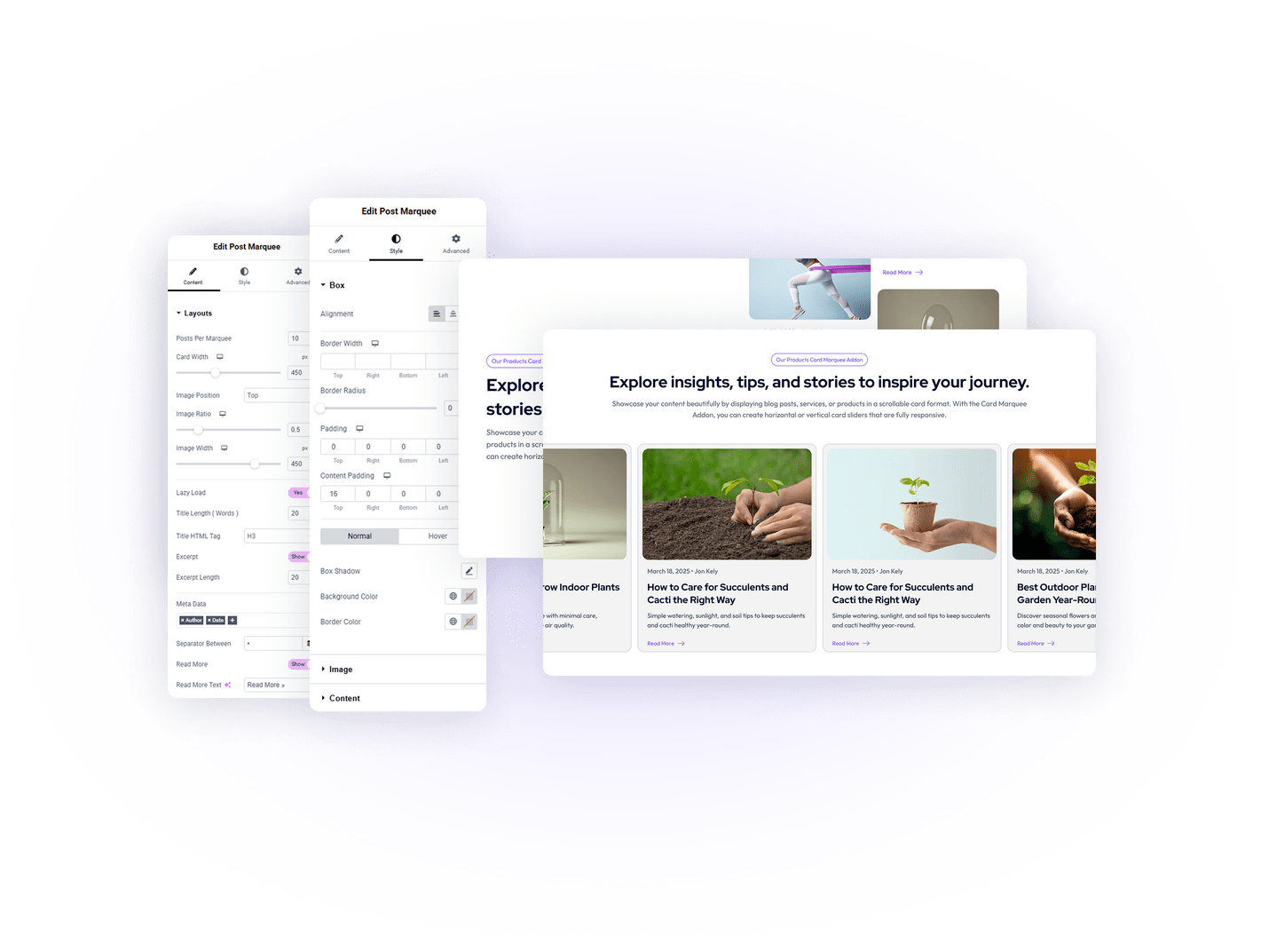 Showcase your content beautifully by displaying blog posts, services, or products in a scrollable card format. With the Card Marquee Addon, you can create horizontal or vertical card sliders that are fully responsive.